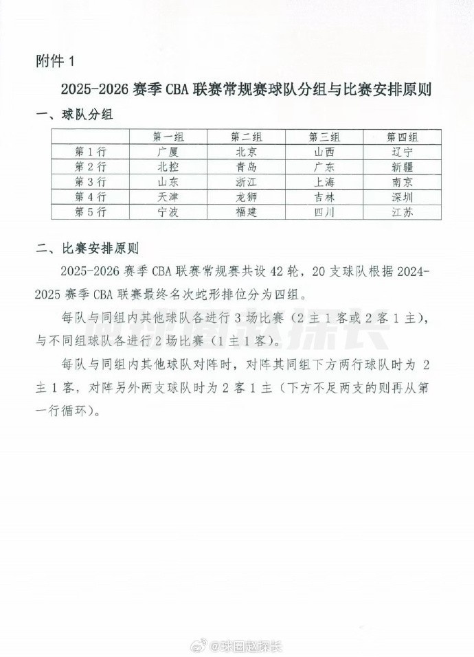 新赛季CBA各队分4组共42轮 同组对手2客1主或1客2主&组外1客1主