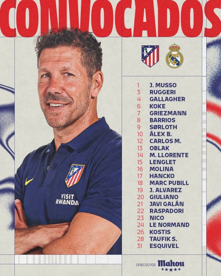 马竞大名单:1-穆索、3-鲁杰里、4-加拉格尔、6-科克、7-格列兹曼、8-巴里奥斯、9-索尔洛特、10-巴埃纳、12-卡洛斯-马丁、13-奥布拉克、14-马科斯·略伦特、15-朗格莱、16-莫利纳、17-汉茨科、18-普比尔、19-阿尔瓦雷斯、20-朱利亚诺-西蒙尼、21-加兰、22-拉斯帕多里、23-尼科-冈萨雷斯、24-勒诺尔芒、26-科斯蒂斯、28-陶菲克、31-埃斯基韦尔