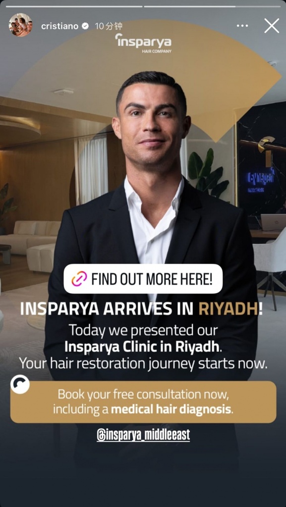 10月02日讯 就在刚刚,C罗在个人IG罕见开启直播,宣布其个人旗下的植发诊所将在沙特利雅得开分店。