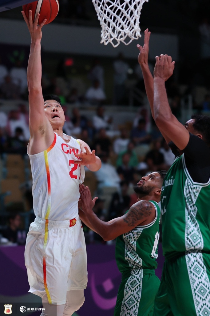 暂停回来,沙特队在阿卜杜拉赫曼的带领下接连追分,但高诗岩在本节末段的连续助攻王俊杰和胡金秋,让中国队再次拉开分差。上半场结束时,中国男篮53比43,带着10分的领先进入更衣室。前两节中国男篮在多项数据上领先沙特队,如篮板(19比13)、助攻(14比6)、三分命中率(50%比37%)。但需要注意的是,中国队的犯规次数(10比9)略多,并送给对手16次罚球机会,这说明沙特队对于内线的冲击力非常强。