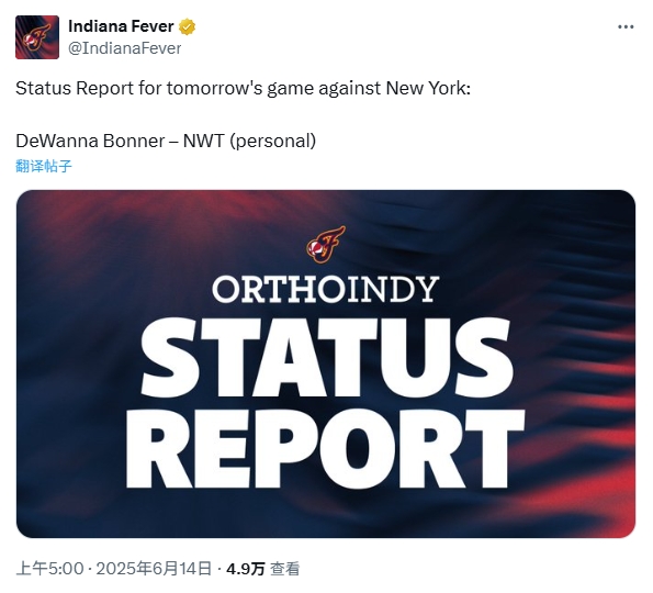 狂热主帅:若不出现伤情反复 凯特琳-克拉克明日预计可复出